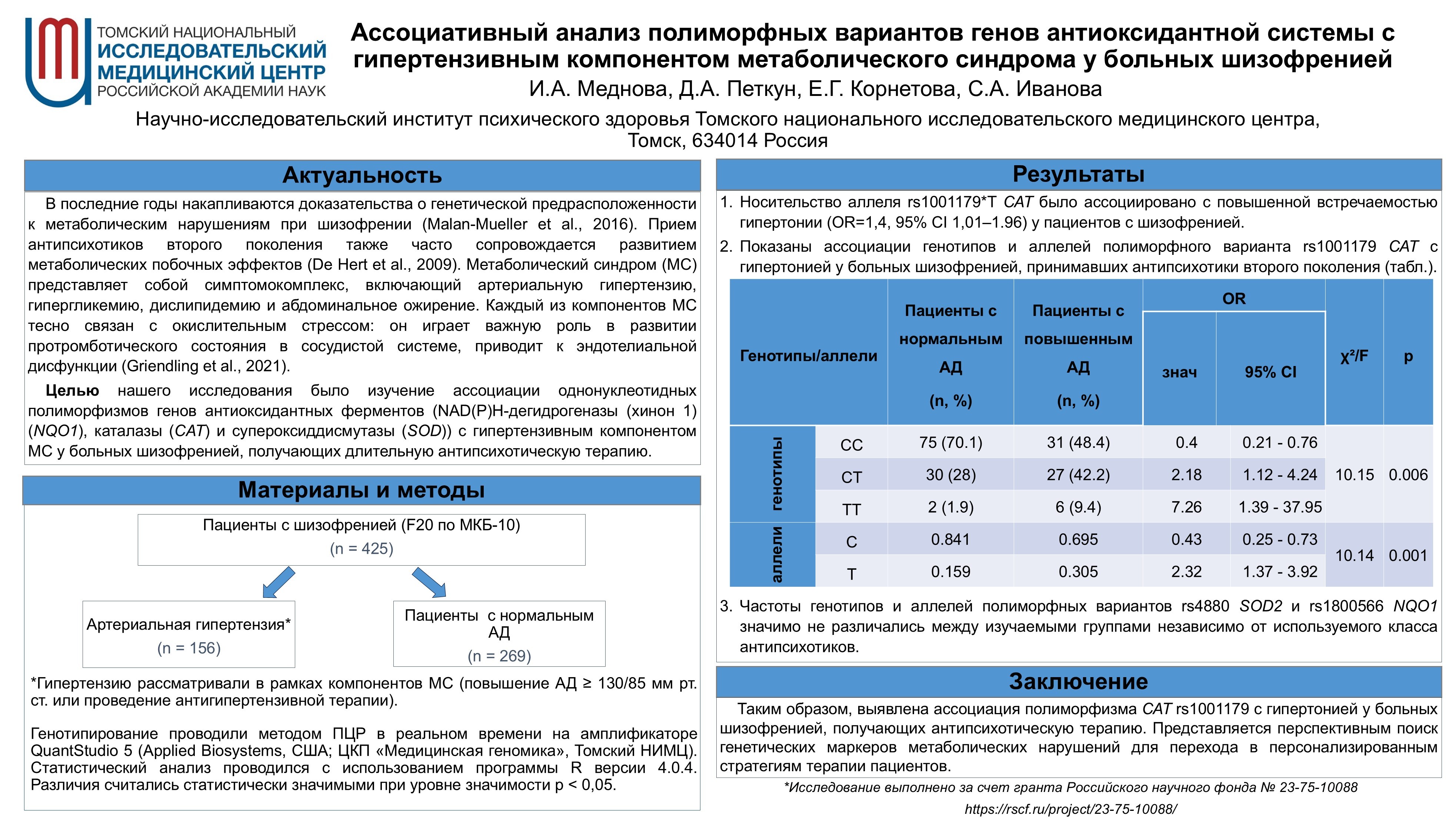 АССОЦИАТИВНЫЙ АНАЛИЗ ПОЛИМОРФНЫХ ВАРИАНТОВ ГЕНОВ АНТИОКСИДАНТНОЙ СИСТЕМЫ С ГИПЕРТЕНЗИВНЫМ КОМПОНЕНТОМ МЕТАБОЛИЧЕСКОГО СИНДРОМА У БОЛЬНЫХ ШИЗОФРЕНИЕЙ